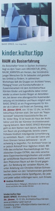 Als Botschafter*innen in Sachen Architektur liegt es dem Team vom ARCHITEKTUR_SPIEL_RAUM_KÄRNTEN am Herzen, das Verständnis junger Menschen für ihr bebautes und gestaltetes Umfeld zu fördern. In zahlreichen Workshops lädt die Gruppe von Architekt*innen, Pädagog*innen und Kunstschaffenden in Zusammenarbeit mit dem Architektur Haus Kärnten Kinder und Jugendliche daher immer wieder zu einem bunten Reigen an Aktivitäten ein, bei denen eine altersgerechte Auseinandersetzung mit Architektur und Raum möglich wird. BASIC SPACE ist ein Programm für Kinder ab 6 Jahren und findet am Samstag, dem 26. Jänner 2019 , von 10 bis 12 Uhr, im Architektur Haus Kärnten statt.