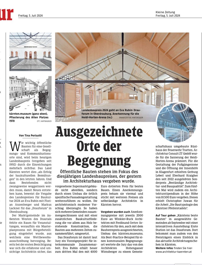 Wie wichtig öffentliche Bauten für eine Gesellschaft als Begegnungs- und Kommunikationsorte sind, wird beim heurigen Landesbaupreis (vergeben seit 1992) durch die Einreichungen mehrfach sichtbar. Das Land Kärnten wertet dies „als Erfolg der baukulturellen Bemühungen“ in den letzten Jahren. Und dass Bestehendes nicht zwangsweise weggerissen werden muss, damit Neues entstehen kann, beweist die Vergabe des Landespreises für Baukultur 2024 an Eva Rubin mit Florian Anzenberger und Markus Lackner für das „Drauforum“ in Oberdrauburg.