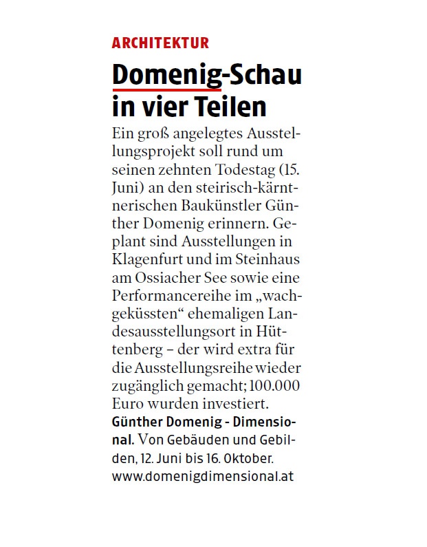 Ein groß angelegtes Ausstellungsprojekt soll rund um seinen zehnten Todestag (15. Juni) an den steirisch-kärntnerischen Baukünstler Günther Domenig erinnern. Geplant sind Ausstellungen in Klagenfurt und im Steinhaus am Ossiacher See sowie eine Performancereihe im „wachgeküssten“ ehemaligen Landesausstellungsort in Hüttenberg – der wird extra für die Ausstellungsreihe wieder zugänglich gemacht; 100.000 Euro wurden investiert.