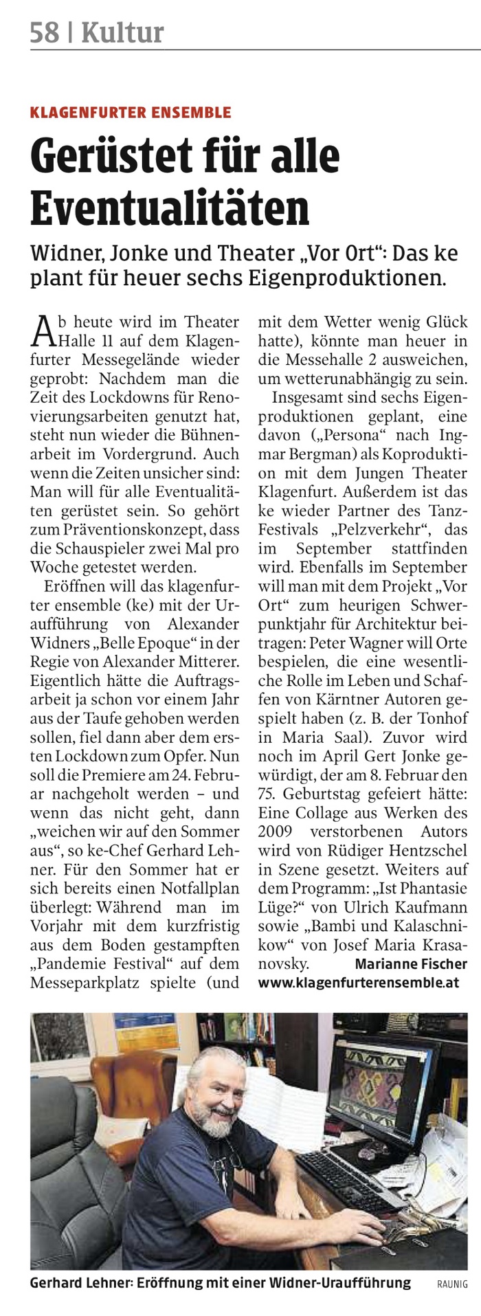 Ab heute wird im Theater Haööe 11 auf dem Klagenfurter Messegelände wieder geprobt: Nachdem man die Zeit des Lockdowns für Renovierungsarbeiten genutzt hat, steht nun wieder die Bühnenarbeit im Vordergrund. Auch wenn die Zeiten unsicher sind: Man will für alle Eventualitäten gerüstet sein. So gehört zum Präventionskonzept, dass die Schauspieler zwei Mal pro Woche getestet werden. Eröffnen will das klagenfurter ensemble (ke) mit der Uraufführung von Alexander Widners "Belle Epoque" in der Regie von Alexander Mitterer. Eigentlich hätte die Auftragsarbeit ja schon vor einem Jahr aus der Taufe gehoben werden sollen, fiel dann aber dem ersten Lockdown zum Opfer. Nun soll die Premiere am 24. Februar nachgeholt werden - und wenn das nicht geht, dann "weichen wir auf den Sommer aus", so ke-Chef Gerhard Lehner. Für den Sommer hat er sich bereits einen Notfallplan überlegt: Während man im Vorjahr mit dem kurzfristig aus dem Boden gestampften "Pandemie Festival" auf dem Messeparkplatz spiele (und mit dem Wetter wenig Glück hatte), könnte man heuer un die Messehalle 2 ausweichen, um wetterunabhängig zu sein. Insgesamt sind sechs Eigenproduktionen geplant, eine davon ("Persona" nach Ingmar Bergman) als Koproduktion mit dem Jungen Theater Klagenfurt. Außerdem ist das ke wieder Partner des Tanz-Festivals "Pelzverkehr", das im September stattfinden wird. Ebenfalls im September will man mit dem Projekt „Vor Ort“ zum heurigen Schwerpunktjahr für Architektur beitragen: Peter Wagner will Orte bespielen, die eine wesentliche Rolle im Leben und Schaffen von Kärntner Autoren gespielt haben (z.B. Der Tonhof in Maria Saal). …