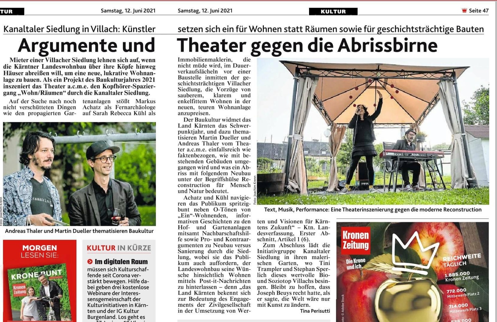 Der Baukultur widmet das LandKärnten das Schwerpunktjahr, und dazu thematisieren Martin Dueller und Andreas Thaler vom Theater a.c.m.e. einfallsreich wie faktenbezogen, wie mit bestehenden Gebäuden umgegangen wird und was ein Abriss mit folgendem Neubau unter der Begriffshülse Reconstruction für Menschen und Natur bedeutet.