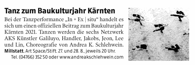 weiterlesen …Bei der Tanzperformance "IN + EX / situ" handelt es sich um einen offiziellen Beitrag zum Baukulturjahr Kärnten 2021. Tanzen werden die sechs Netzwerk AKS Künstler Galiluyo, Handler, Jakobs, Jeon, Lee und Lin, Choreografie von Andrea K. Schlehwein. Millstatt. Art Space/Stift. 27. und 28.08., jeweils 20 Uhr.