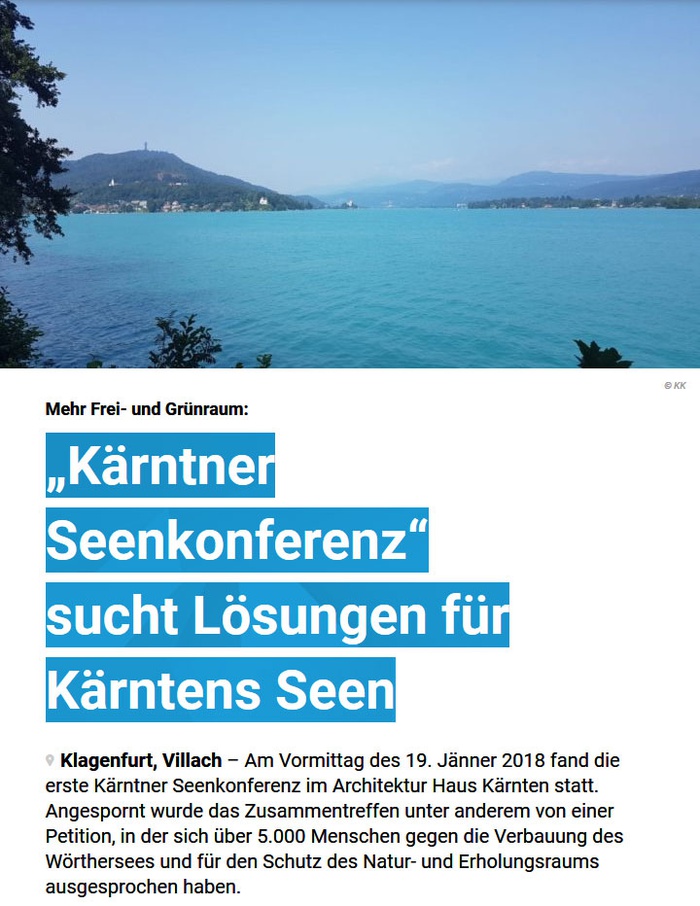 Klagenfurt, Villach – Am Vormittag des 19. Jänner 2018 fand die erste Kärntner Seenkonferenz im Architektur Haus Kärnten statt. Angespornt wurde das Zusammentreffen unter anderem von einer Petition, in der sich über 5.000 Menschen gegen die Verbauung des Wörthersees und für den Schutz des Natur- und Erholungsraums ausgesprochen haben.