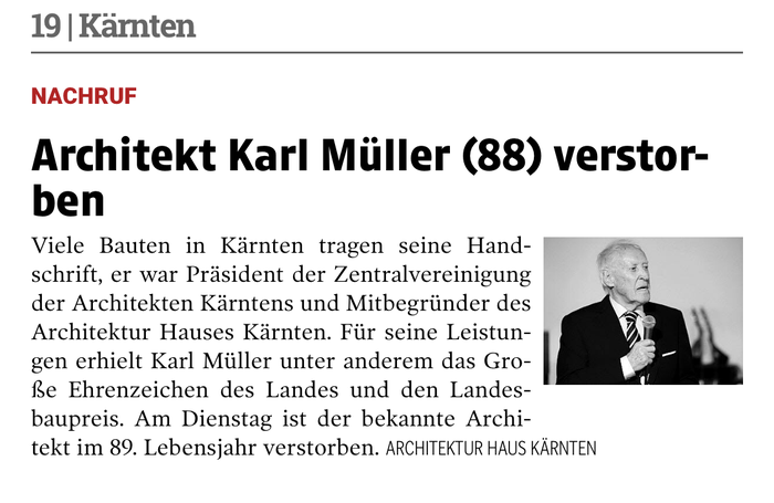 Kleine Zeitung: "Architekt Karl Müller (88) verstorben"