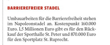 Umbauarbeiten für die Barrierefreiheit stehen im Napoleonstadel an. Kostenpunkt 160.000 Euro. 1,5 Millionen Euro gibt es für den Rückkauf der Sporthalle St. Peter und 870.000 Euro für den Sportplatz St. Ruprecht.