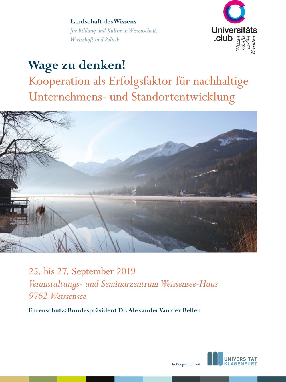 TagungDie Veranstaltungsserie „Wage zu denken“ des Universitäts.club | Wissenschaftsverein Kärnten vom 25. bis 27. September 2019 versammelt auch heuer wieder hochkarätige Experten im Veranstaltungs- und Seminarzentrum „Weissensee-Haus“. Diesmal thematisieren wir Kooperation als Erfolgsfaktor für nachhaltige Unternehmens- und Standortentwicklung!
