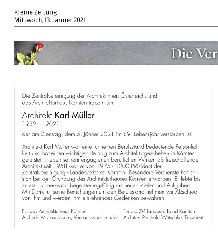 NachrufBaurat h.c., Architekt, Mag.arch. Karl MÜLLER (2.8.1932-5.1.2021) war seit 1958 als freischaffender Architekt in Klagenfurt tätig. Zahlreiche bedeutende und ortsbildprägende Schul-, Wohn- und Gewerbebauten im Land tragen seine Handschrift. Architekt Müller war langjähriger Präsident, dann Ehrenpräsident der Zentralvereinigung der ArchitektInnen Kärntens, 1992 war er federführender Mitbegründer des Architektur Hauses Kärnten und erhielt für seine Leistungen das Große Ehrenzeichen des Landes, den Landesbaupreis, den Österreichischen Holzbaupreis und andere Ehrungen. Mit Karl Müller verlieren wir einen steten Kämpfer für baukulturelle Anliegen in Kärnten.