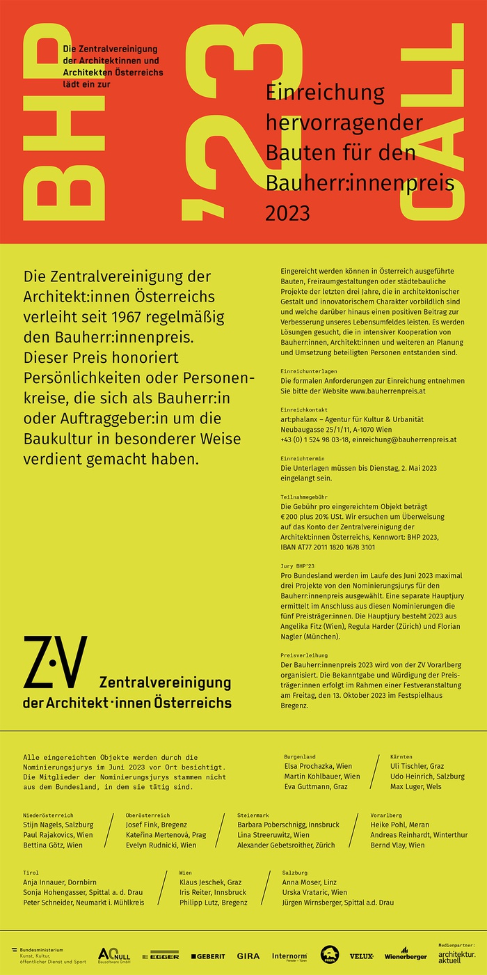 Die Auswahl der Projekte erfolgt in erster Instanz über Nominierungsjurys in den einzelnen Bundesländern. Daraus ermittelt eine hochkarätige Hauptjury, bestehend u.a. aus Angelika Fitz (Direktorin des Az W – Architekturzentrum Wien) und Florian Nagler (Achitekt, München), anschließend die Preisträger:innen des Bauherr:innenpreises 2023. Die Bekanntgabe und Würdigung der Preisträger:innen erfolgt im Rahmen einer Festveranstaltung am Freitag, den 13. Oktober 2023, im Festspielhaus Bregenz.