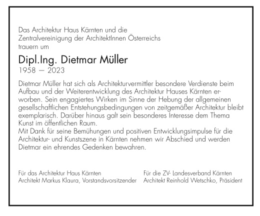 weiterlesen …Dietmar Müller hat sich als Architekturvermittler besondere Verdienste beim Aufbau und der Weiterentwicklung des Architektur Haus Kärnten erworben. Sein engagiertes Wirken im Sinne der Hebung der allgemeinen gesellschaftlichen Entstehungsbedingungen von zeitgemäßer Architektur bleibt exemplarisch. Darüber hinaus galt sein besonderes Interesse dem Thema Kunst im öffentlichen Raum. Mit Dank für seine Bemühungen und positiven Entwicklungsimpulse für die Architektur- und Kunstszene in Kärnten nehmen wir Abschied und werden ihm ein ehrendes Gedenken bewahren.