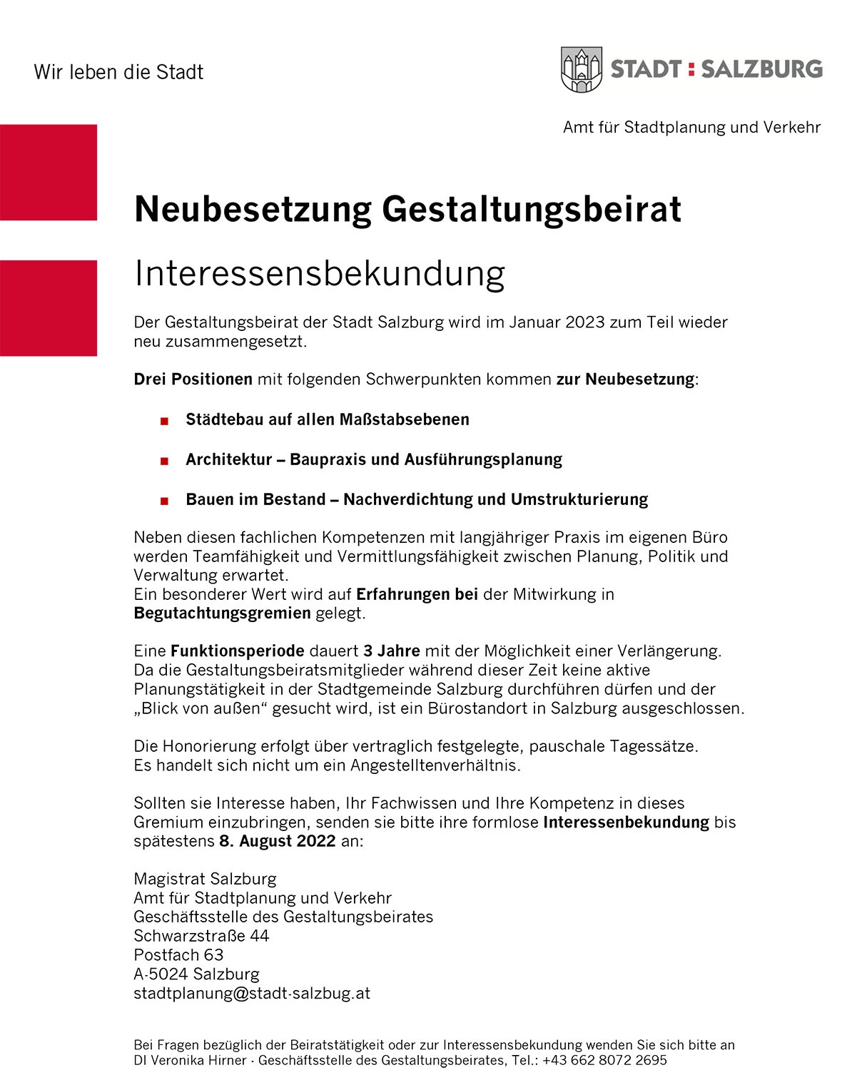 Bei Fragen bezüglich der Beiratstätigkeit oder zur Interessensbekundung wenden Sie sich bitte an DI Veronika Hirner - Geschäftsstelle des Gestaltungsbeirates, Tel.: +43 662 8072 2695