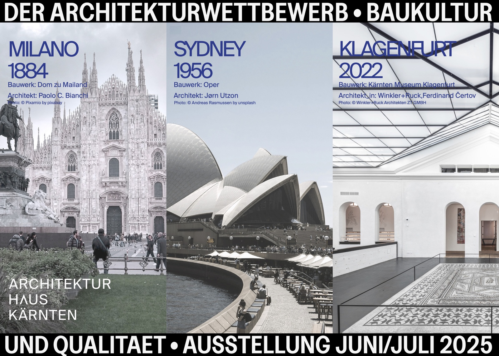 Die Ausstellung zeigt eine Auswahl von Architekturwettbewerben, die in den letzten Jahren in Kärnten durchgeführt wurden. Besucher: innen haben die Möglichkeit, die Vielfalt der Aufgabenstellungen und der Lösungsansätze zu vergleichen. Zusätzlich wird ein Einblick in die organisatorischen Prozesse, den Ablauf eines [Architektur-]Wettbewerbsverfahren geboten und dessen Bedeutung sowie Mehrwert für baukulturelle Qualität sichtbar.