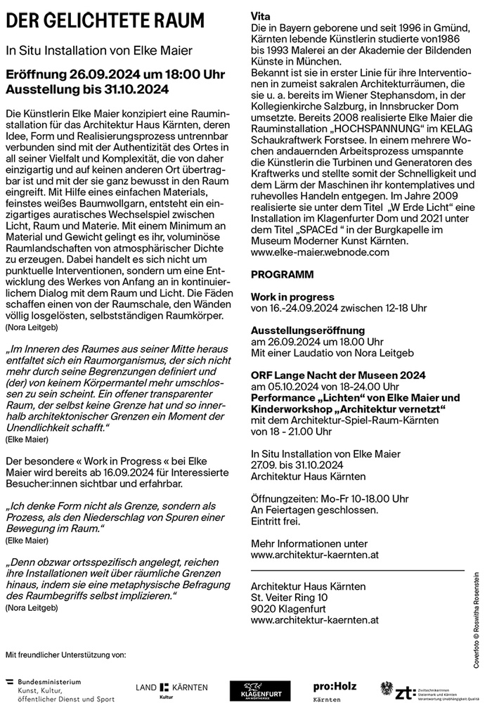 InstallationDie Künstlerin Elke Maier konzipiert eine Rauminstallation für das Architektur Haus Kärnten, deren Idee, Form und Realisierungsprozess untrennbar verbunden sind mit der Authentizität des Ortes in all seiner Vielfalt und Komplexität, die von daher einzigartig und auf keinen anderen Ort übertragbar ist und mit der sie ganz bewusst in den Raum eingreift. Mit Hilfe eines einfachen Materials, feinstes weißes Baumwollgarn, entsteht ein einzigartiges auratisches Wechselspiel zwischen Licht, Raum und Materie. Mit einem Minimum an Material und Gewicht gelingt es ihr, voluminöse Raumlandschaften von atmosphärischer Dichte zu erzeugen. Dabei handelt es sich nicht um punktuelle Interventionen, sondern um eine Entwicklung des Werkes von Anfang an in kontinuierlichem Dialog mit dem Raum und Licht. Die Fäden schaffen einen von der Raumschale, den Wänden völlig losgelösten, selbstständigen Raumkörper. (Nora Leitgeb)