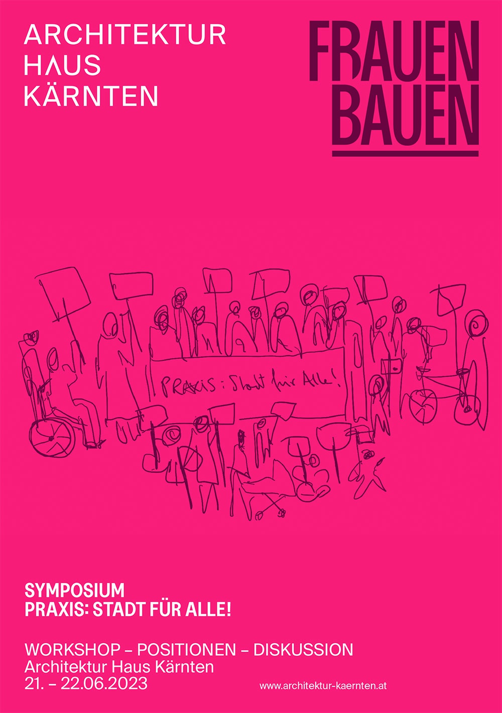 Workshop, Positionen, DiskussionDer Schwerpunkt FRAUEN BAUEN wird mit einem zweitägigen Symposium mit Workshop, Positionen sowie einer Diskussion geschlossen. Wir stellen Fragen zur Verantwortung einer neuen Praxis für eine lebenswerte Stadt der Zukunft und wollen damit einen Startpunkt für weitere Formate und Veranstaltungen zu diesem Thema setzen. Das Programm wird kuratiert und begleitet von Marlene Wagner, Veronika Platz und Raffaela Lackner.