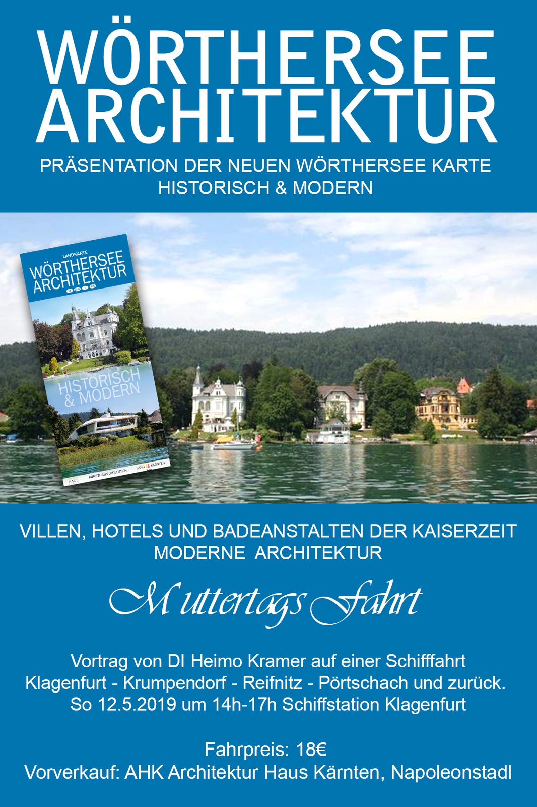 Die Faltkarte präsentiert im historischen Teil zahlreiche Villen, Hotels, Bade- und Bootshäuser aus der Kaiserzeit im Zeitraum zwischen 1864-1938. Diese historische Wörthersee Architektur strahlt einen besonderen Reiz durch die harmonische Integration der Architektur in die Umgebung aus. Der moderne Teil gibt einen Überblick über zeitgenössische Bauten, die danach entstanden sind und beispielhafte architektonische Qualität repräsentieren.