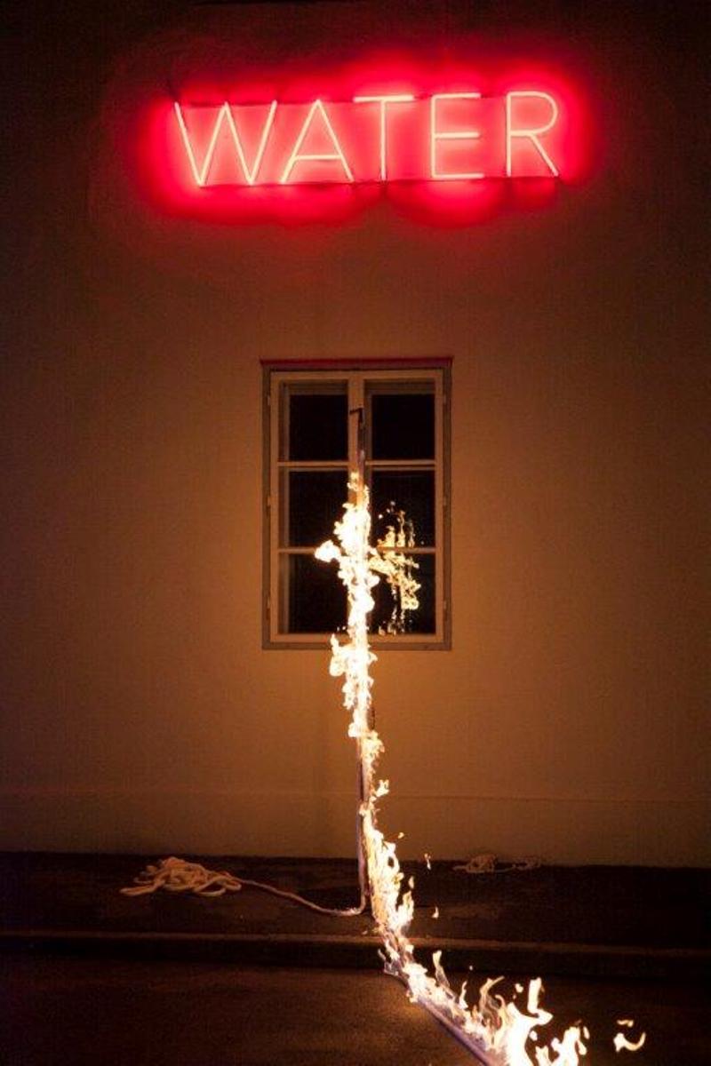 Zur Eröffnung der Installation ist eine Feuerlinie zwischen FIRE und WATER entflammt. Die Aktion schaffte einen Erlebnisraum für die BesucherInnen und band den lokalen Feuerschutz in das Kunstprojekt ein. In Zusammenarbeit mit der Klagenfurter Feuerwehr wurde eine kontrollierte Brandlinie durch den Park gelegt und im Zuge einer feierlichen Zeremonie von der Bürgermeisterin, Dr. Maria-Luise Mathiaschitz, entzündet. Zuerst erleuchtete die Neonschrift FIRE, dann entzündete sich die Feuerlinie, das Feuer bewegte sich durch den Park (Foto 1-3) und löste schließlich das Erleuchten des Schriftzugs WATER auf der gegenüberliegenden Fassade aus (Foto 4).